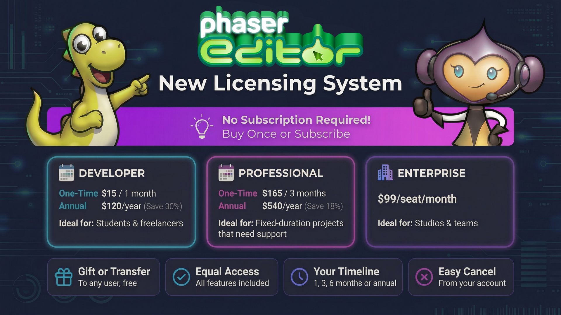Pay only for what you need. Phaser Editor introduces one-time, fixed-duration licences: buy for one, three, or six months, and that's it. Perfect for freelancers, students, and short-term projects who don't want rolling subscriptions. Pay once, use it for your chosen period, and it simply expires. No auto-renewals, no forgotten charges 👛👌.