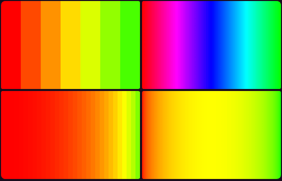 Gradient is now a GameObject (not an FX anymore) and vastly more powerful. Create linear, bilinear, radial, and conic gradients with as many colors as you want. Control gradients in HSV, split them into quantized levels, shape them with interpolation, and apply dither options with interleaved gradient noise (IGN) to smooth out the image.